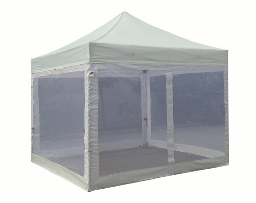 4 zippered white screen sidewalls with one entry door,Bottom and Side Lining - Polyethelene.Wheeled bag with 2.7" wheels,The Best design and easy to handle even on rough ground.Canopy top:400 Denier Polyester,Water Resistant,100% UV Protection,Fire Resistant: CPAI-84/ULC S109 & NFPA 701 Flame Retardancy Standards.canopy size:10x10Feet. weight:8LBS.Frame size:10x10Feet / weight:64LBS. Heavy duty steel Construction.1 1/4 Inches leg and 1 x 1/2 Inches Truss Bar. Full Truss Design,Adjustable Height,No Tools Necessary for Setup..Eurmax Standard Canopy (10x10feet) Includes:Canopy Top, Canopy Frame,Four(4) Screen Walls,Awning,Roller Bag.Four(4)Stakes.No loose parts; No tools required...Eurmax Standard Ez Pop up Canopy with Four (4) Screen Walls and Wheeled Bag Bonus Awning (10x10ft, Grey Top with White Screen Features.