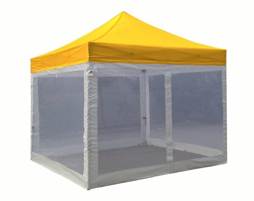 4 zippered white screen sidewalls with one entry door,Bottom and Side Lining - Polyethelene.Canopy top:400 Denier Polyester,Water Resistant,100% UV Protection,Fire Resistant: CPAI-84/ULC S109 & NFPA 701 Flame Retardancy Standards.canopy size:10x10Feet. weight:8LBS.Frame size:10x10Feet / weight:64LBS. Heavy duty steel Construction.1 1/4 Inches leg and 1 x 1/2 Inches Truss Bar. Full Truss Design,Adjustable Height,No Tools Necessary for Setup..Eurmax Standard Canopy (10x10feet) Includes:Canopy Top, Canopy Frame,Four(4) Screen Walls,Awning,Roller Bag.Four(4)Stakes.No loose parts; No tools required..Wheeled bag with 2.7" wheels,The Best design and easy to handle even on rough ground..Screen Tent With Floor Eurmax Standard Ez Pop up Canopy with Four (4) Screen Walls and Wheeled Bag Bonus Awning (10x10ft, Gold Top with White Screen Features.